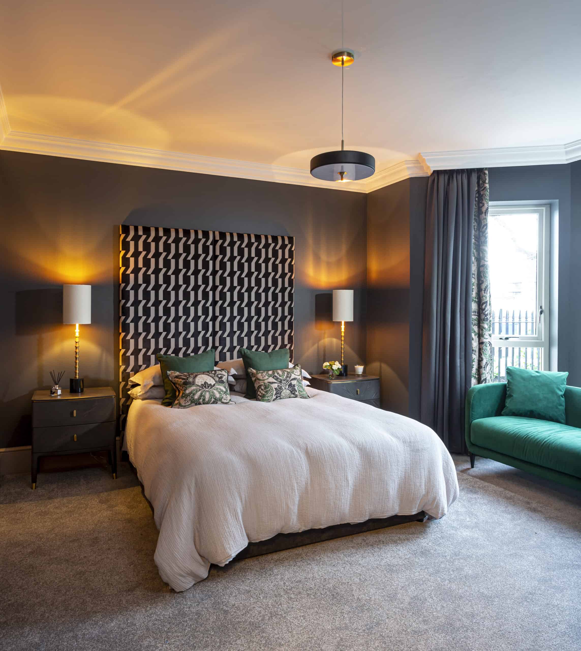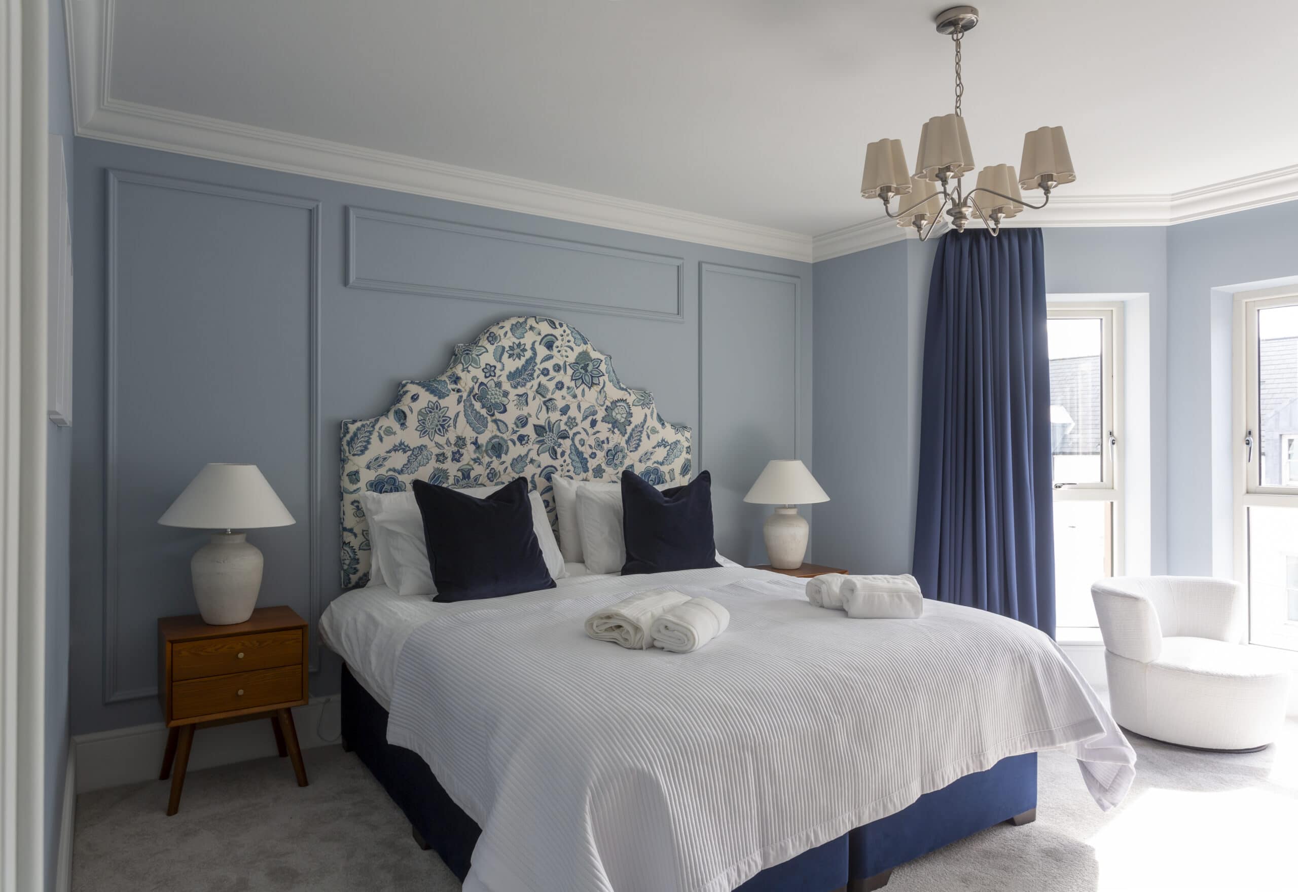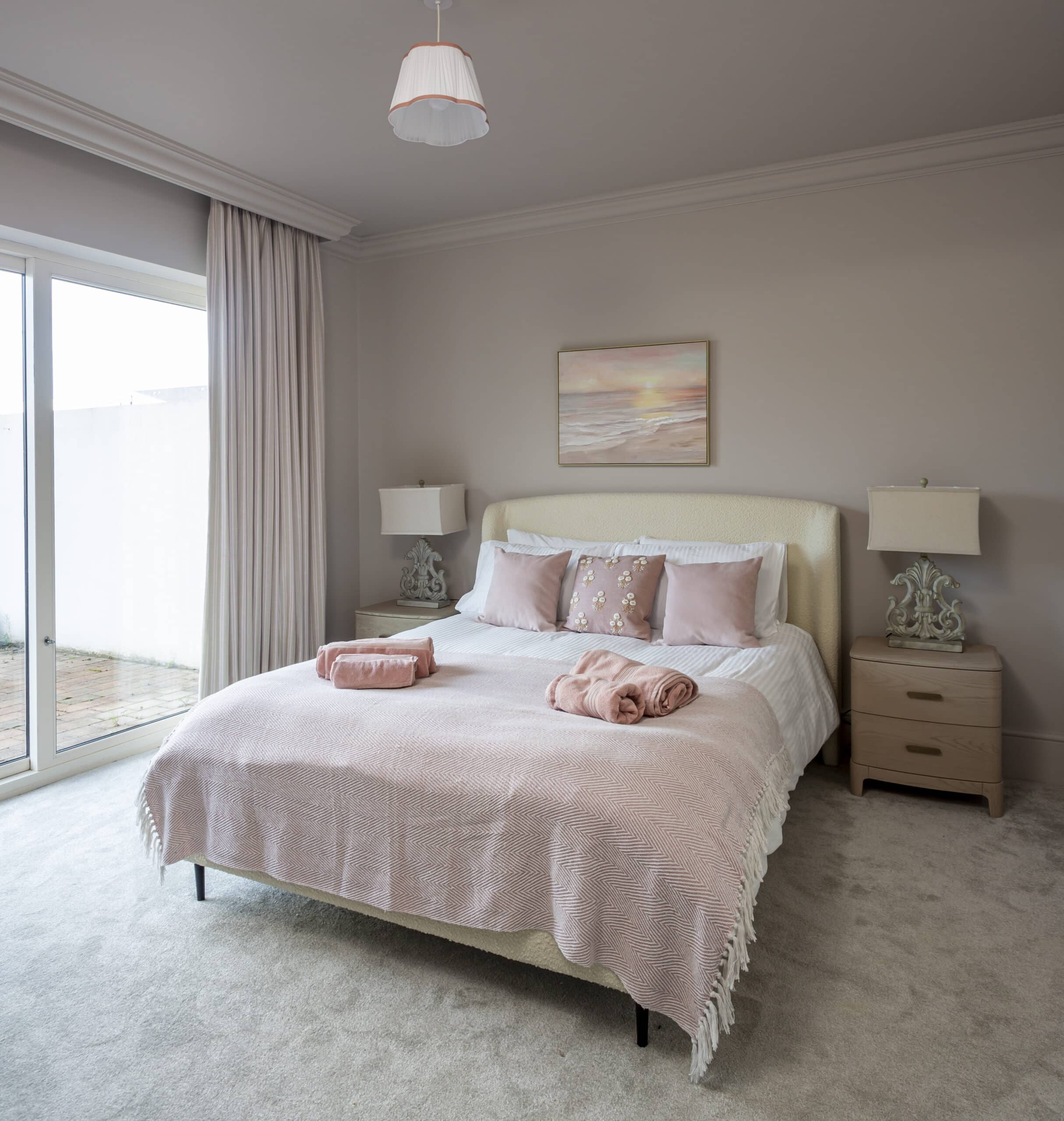 Bedrooms offer a boutique-hotel feel, featuring upholstered headboards, layered textures and carefully selected furnishings that create calm, restful retreats. Large windows allow natural light to flood the rooms, enhancing the sense of space and highlighting the subtle detailing and soft colour schemes.