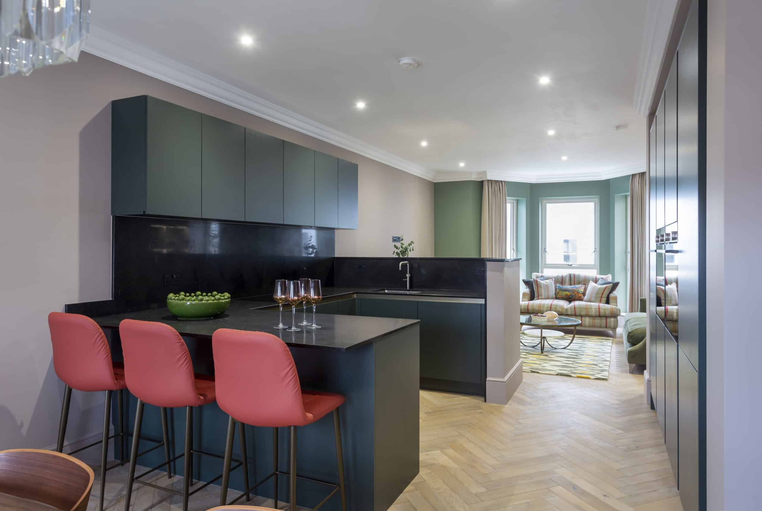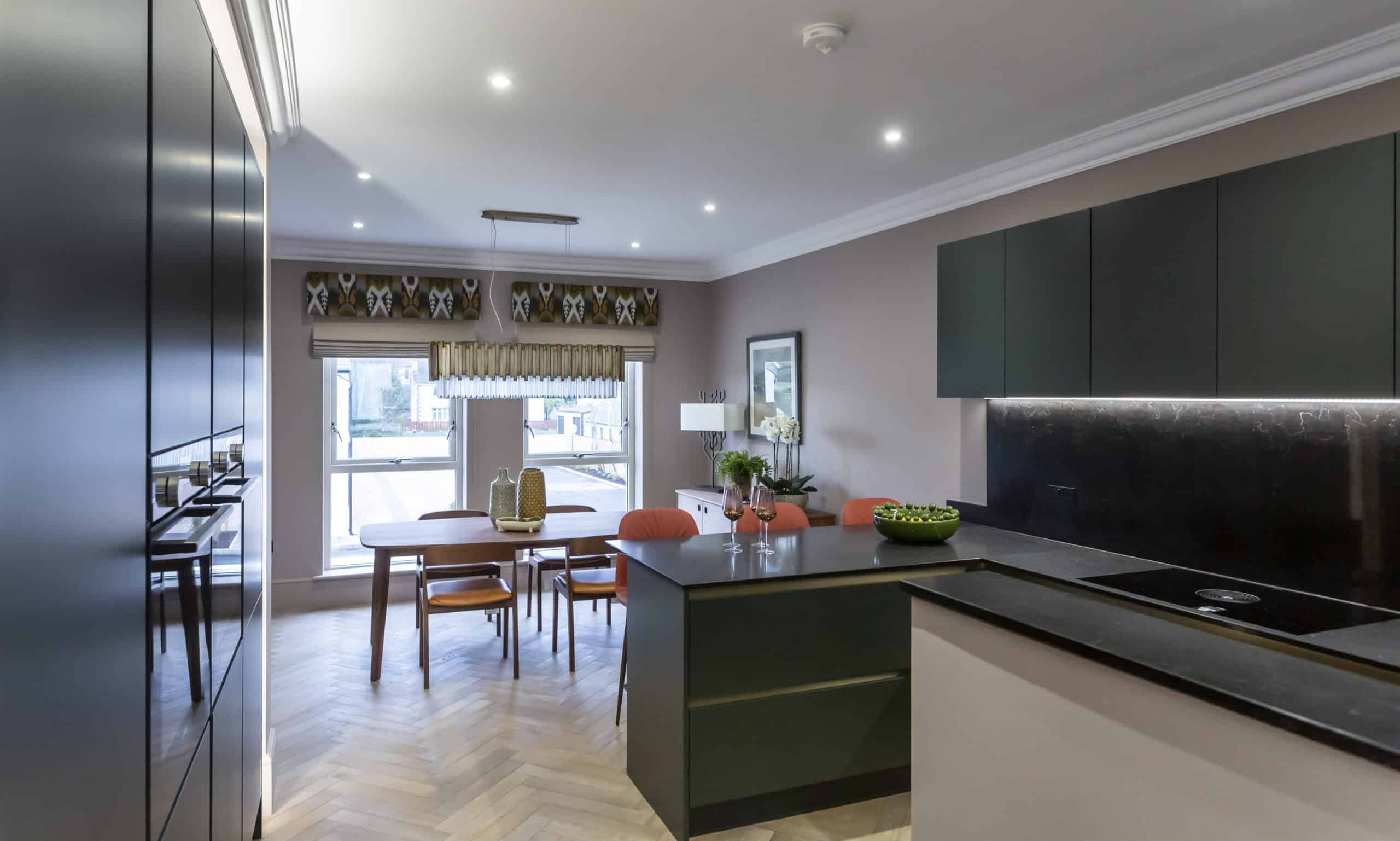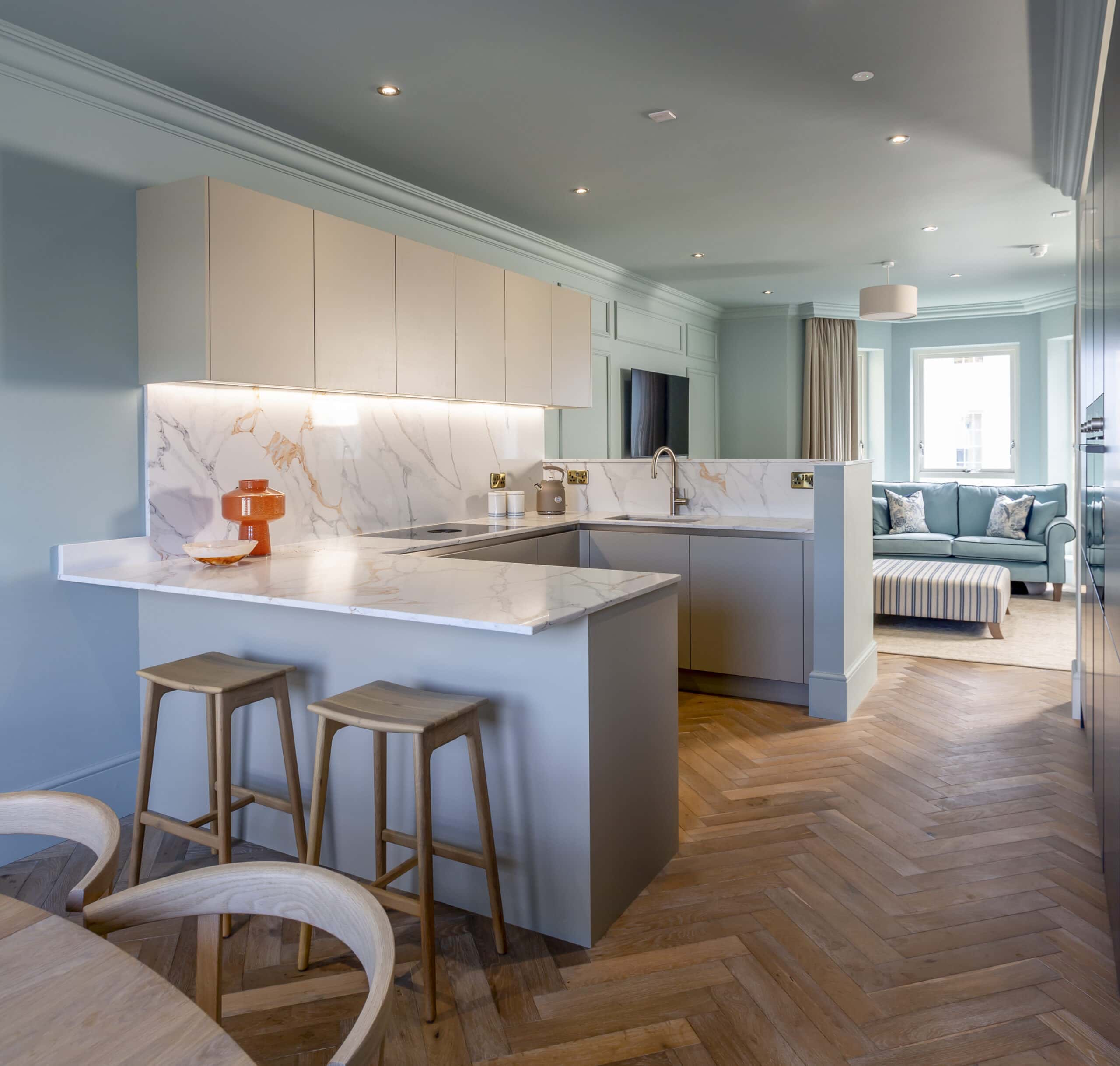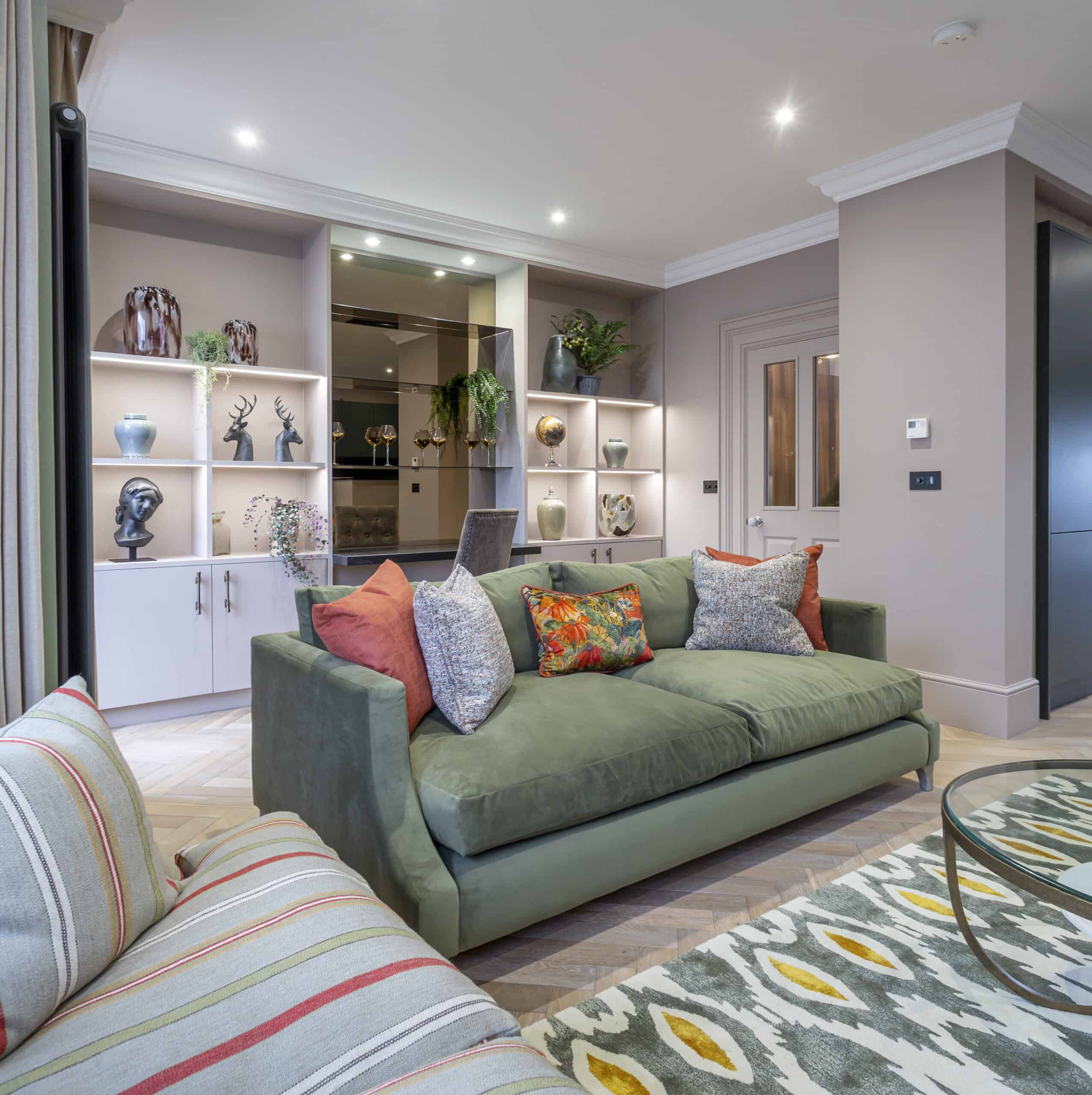 At the heart of these homes, the open-plan kitchen and living areas are both stylish and functional. Sleek cabinetry, statement stone surfaces and warm herringbone timber flooring create a refined yet relaxed environment ideal for everyday living and entertaining. Comfortable seating, bespoke shelving and decorative accents add personality and depth to the living spaces, while elegant panelled walls and tailored upholstery provide a timeless finish.